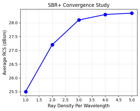 Large scenarios# These examples use PyAEDT to show some general capabilities of HFSS SBR+ for large scenarios Geometry import from maps This example shows how to use PyAEDT to create an HFSS SBR+ project from OpenStreetMap. Environment import from open street map Doppler setup This example shows how to use PyAEDT to create a multipart scenario in HFSS SBR+ and set up a doppler analysis. Doppler setup Reflector This example shows how to use PyAEDT to create an HFSS SBR+ project from an HFSS antenna and run a simulation. Reflector HFSS to SBR+ time animation This example shows how to use PyAEDT to create an SBR+ time animation and save it to a GIF file. HFSS to SBR+ time animation SBR+ convergence analysis This example shows how to perform a convergence study on SBR+ setup parameters to ensure accurate RCS results. SBR+ convergence analysis